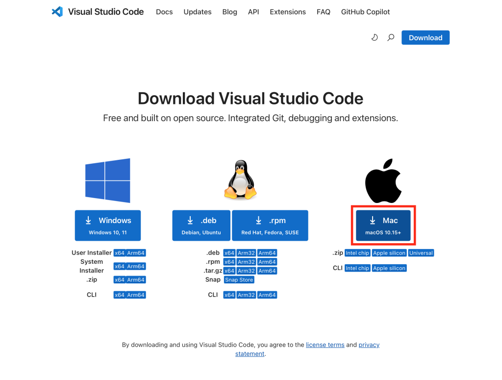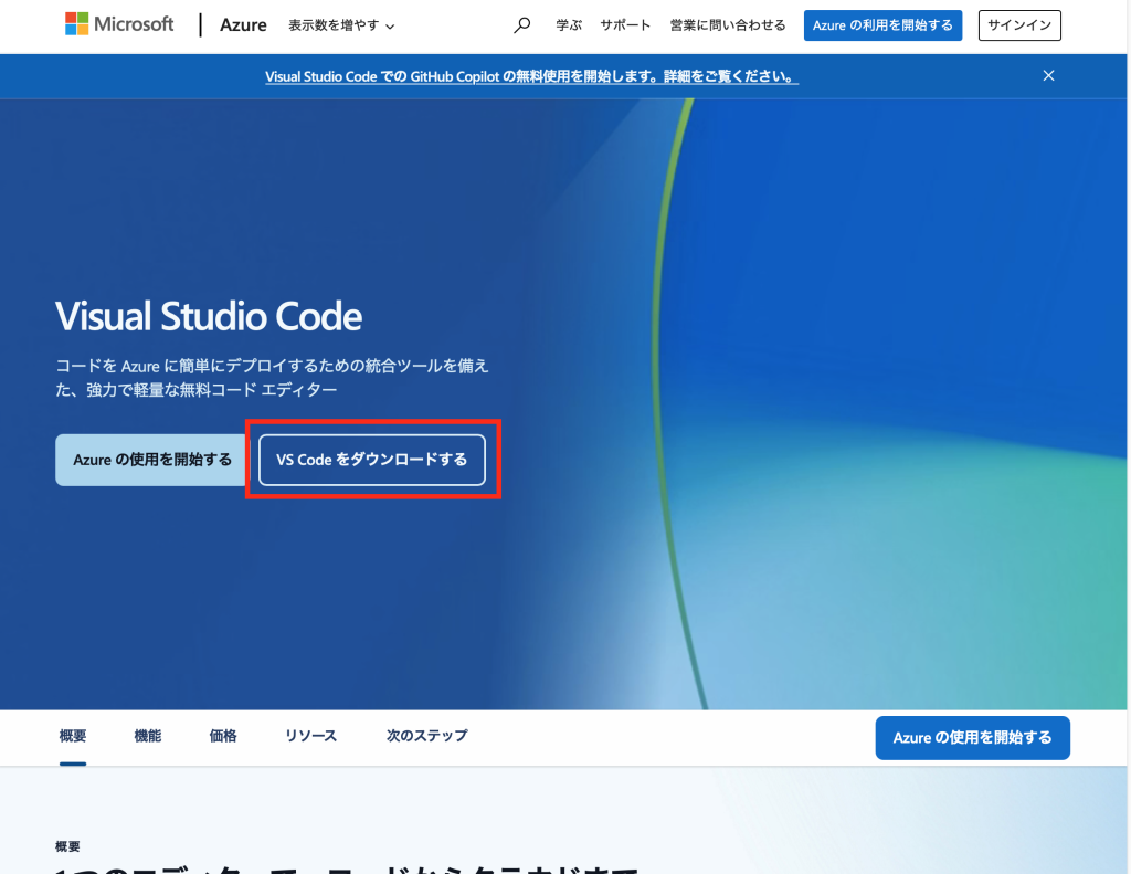 まずは、以下のWebページからVS Codeをダウンロードします。
