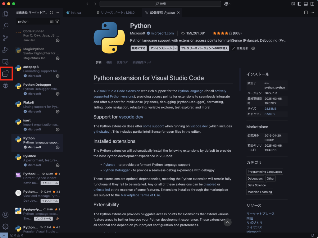 左バーの拡張機能アイコンを選択して、検索窓に「python」と入力・検索してください。以下のPython拡張機能をインストールします。
