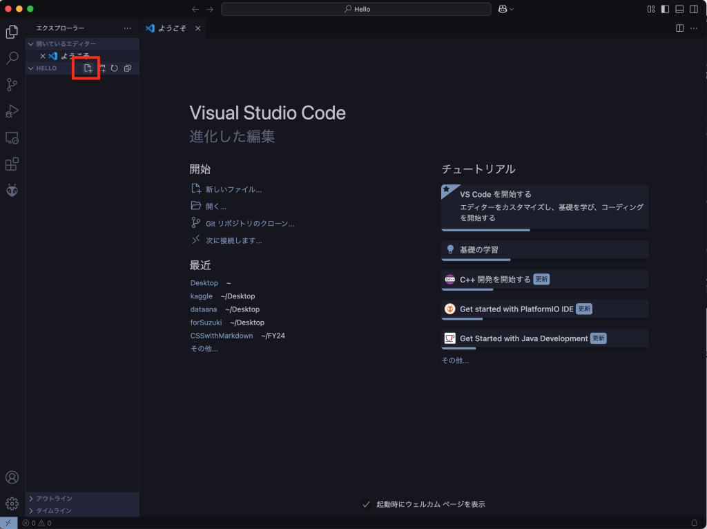 お好きなディレクトリに、フォルダを作成してください。ここでは、デスクトップに、Helloフォルダを作成したとして説明を続けます。